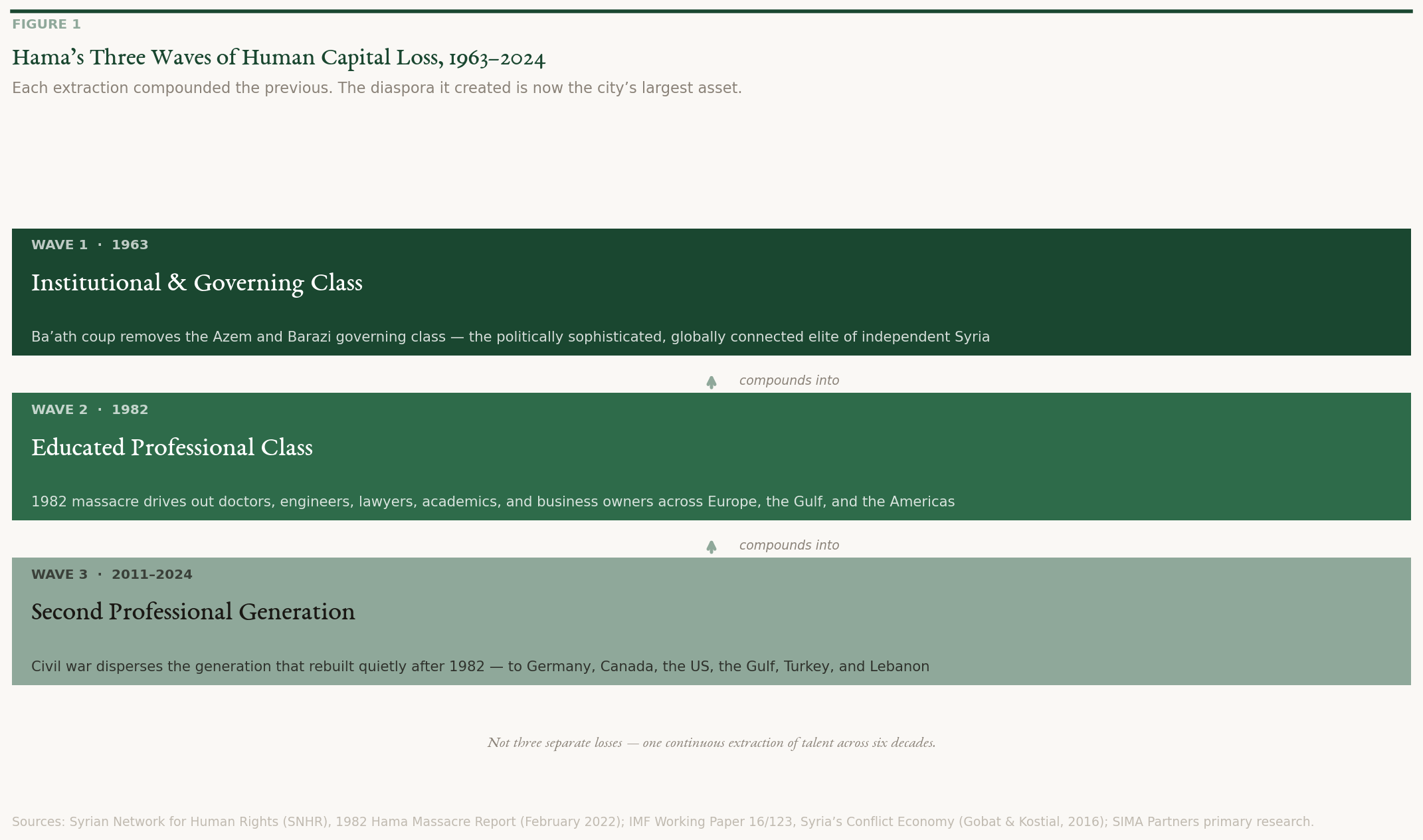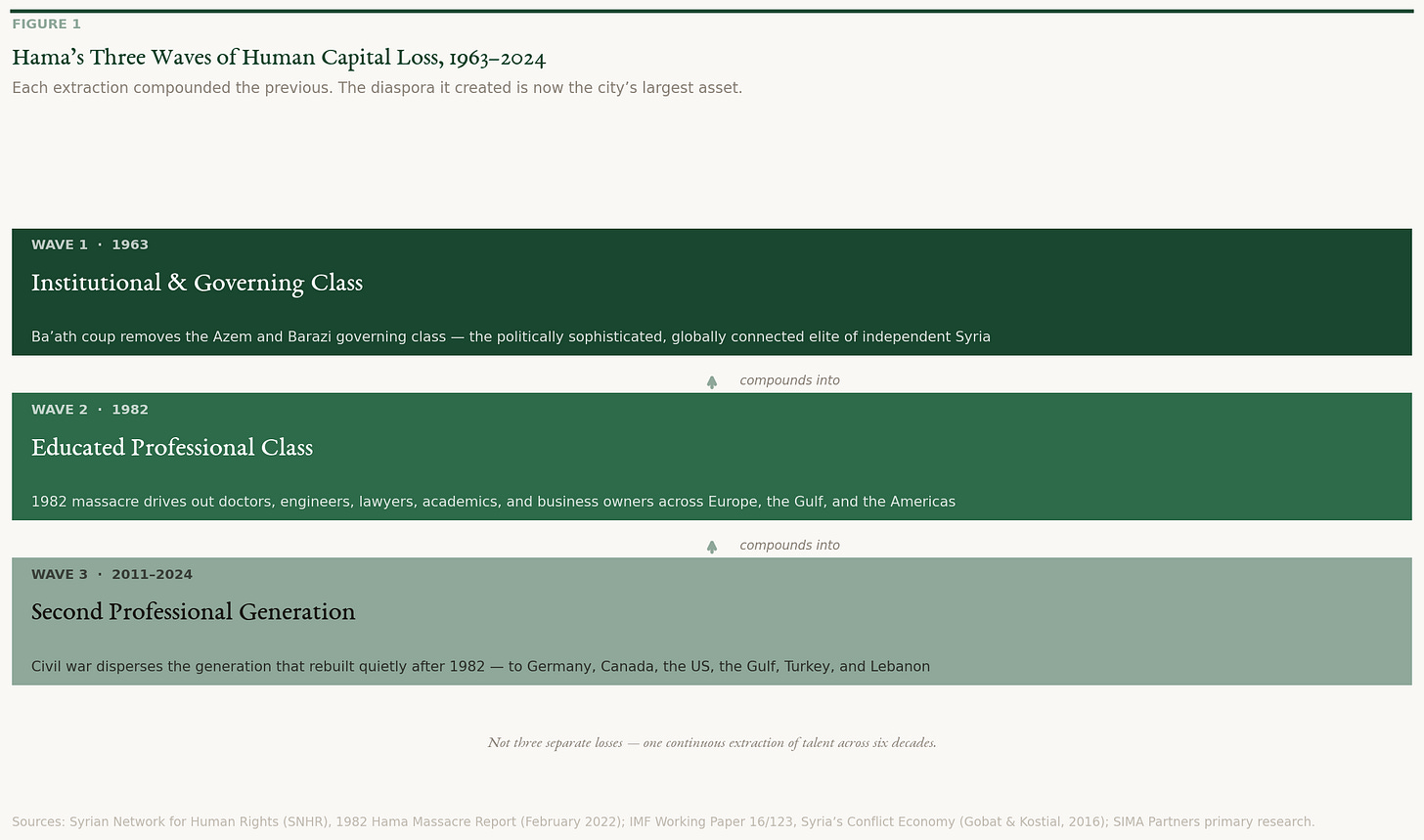 What followed between 2011 and 2024 was war, not the targeted political suppression of 1982 but thirteen years of siege, displacement, barrel bombs, and strangulation. The fighting concentrated in the rural north, Kafr Zita, Latamneh, and the Ghab Plain villages, which aerial strikes reduced to rubble. The city centre was largely spared the physical destruction of Aleppo or Homs, but the population haemorrhaged. The professionals who had survived 1982 in silence, a second generation who had rebuilt quietly across the intervening decades, finally left for Germany, Canada, the United States, the Gulf, Turkey, and Lebanon, carrying with them degrees from the best universities in the Arab world and Europe and skills that would earn them senior positions in multinationals, hospitals, and technology firms abroad. By 2024, Hama had absorbed three successive extractions of human capital across six decades. What the city lost was not wealth. It was the compounding intellectual dividend of three generations of talent.