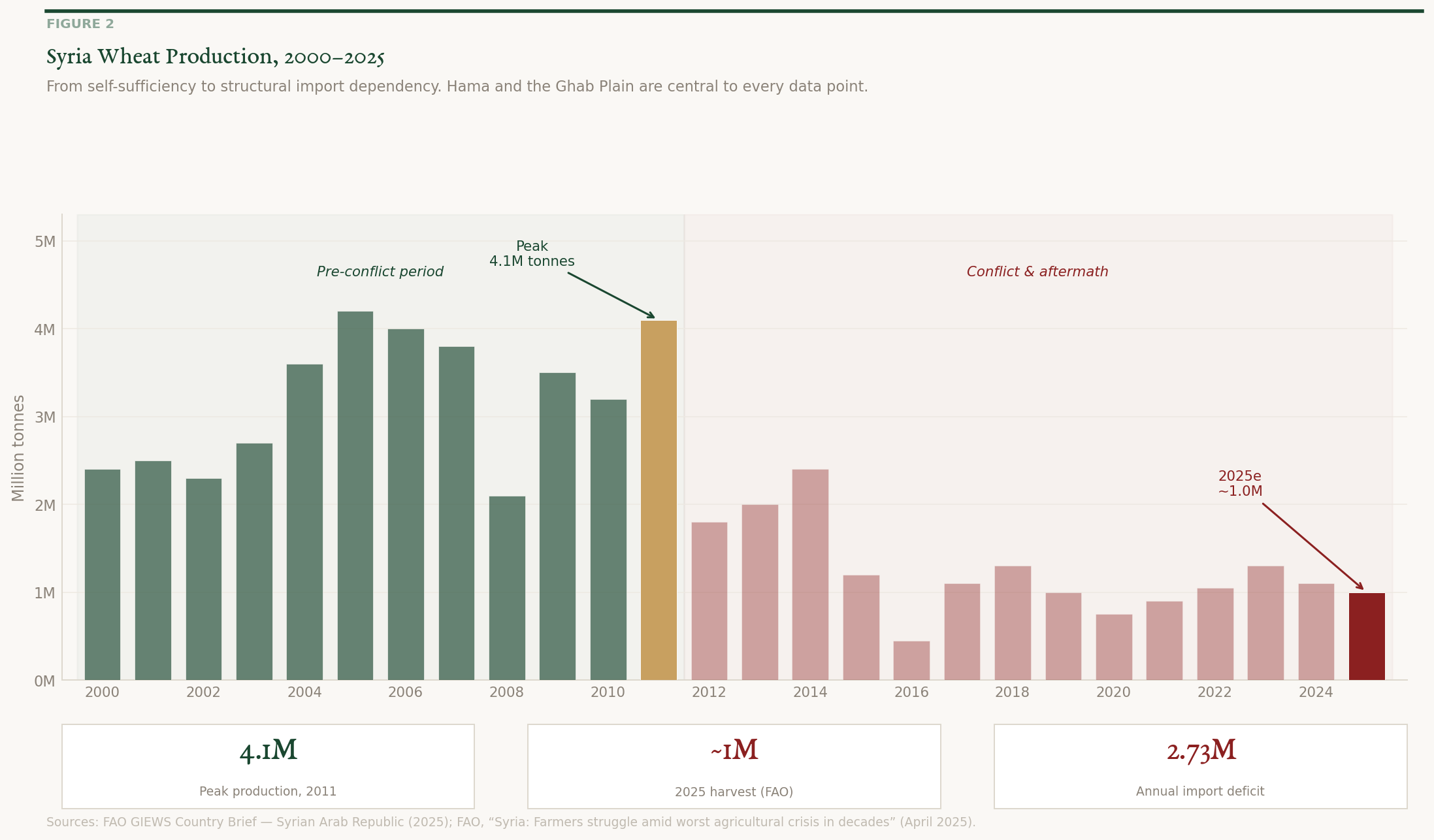 Syria’s wheat production fell from approximately four million tonnes annually before 2011 to between 900,000 and 1.1 million tonnes in 2025, a 60–75 percent decline compounded by the worst drought in sixty years (FAO, June 2025). The Ghab Plain, historically one of Syria’s most fertile zones, was specifically identified by FAO as among the hardest hit by the 2025 drought and the collapse of the Afamia dam through looting and sabotage. Syria now imports wheat from Ukraine, Romania, and Bulgaria to fill an estimated 2.73 million tonne annual deficit.