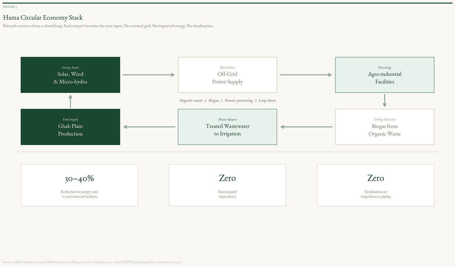 Circular agro-industrial complex: The Ghab Plain’s agricultural output, wheat, sugar beet, cotton, and pistachio, feeds into processing that generates organic waste, which feeds biogas generation, which powers the processing, which returns treated effluent to irrigation, in a closed-loop model that agro-industrial parks in Morocco, Jordan, and Egypt’s Delta have deployed at scale. The Hama version has a natural advantage none of those possess: the Orontes River as a water source that does not depend on desalination or long-distance piping. Capital requirements for an integrated agro-processing and biogas facility run from $20–40 million depending on throughput, and the circular model reduces energy input costs by 30–40 percent against a conventional facility, compressing payback timelines materially.